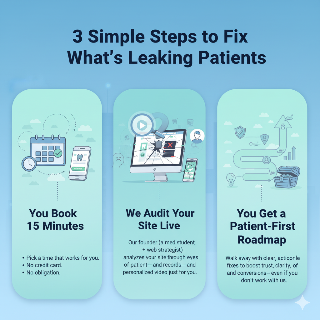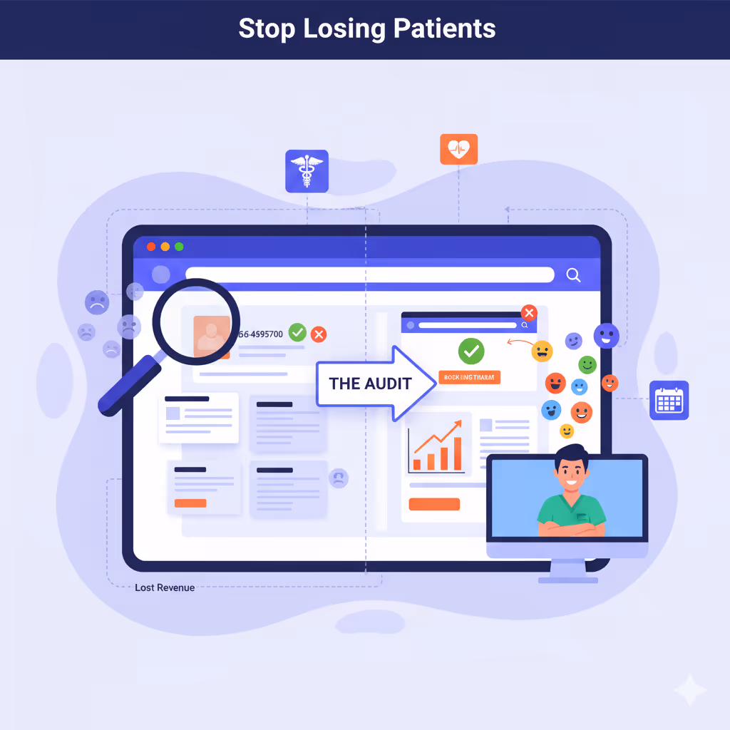 Great! This audit is about patient behavior, not design taste. Many of our clients use their own developers—we just show them what to fix.